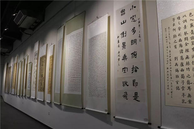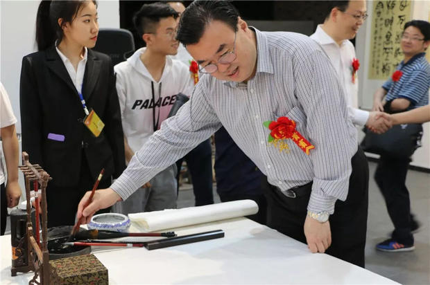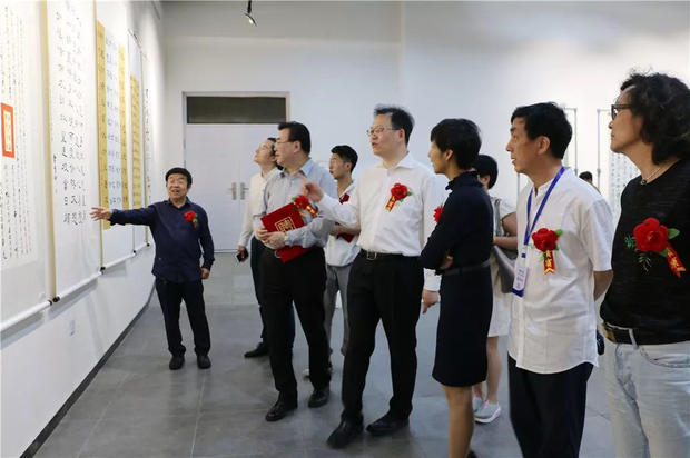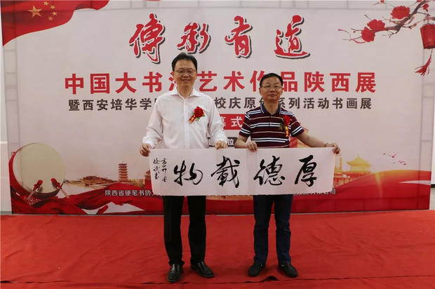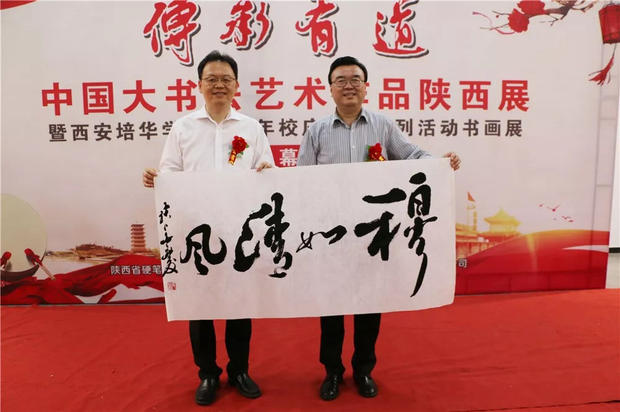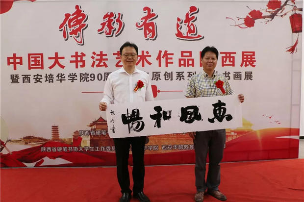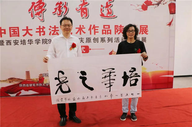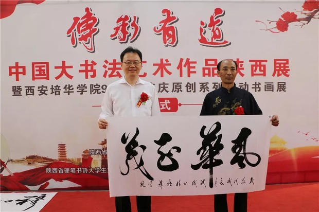 今天下午,“传承有道”中国大书法艺术作品陕西展暨西安培华学院90周年校庆原创系列活动书画展在汇知楼现代艺术馆举行。著名书法家、中国硬笔书法协会主席、民进中央开明画院副院长张华庆,中国硬笔书法协会副主席、陕西省硬笔书法家协会主席、民进陕西开明书画院院长、陕西省书法家协会副主席高继承,宁波市文联原党组书记、宁波市硬笔书法家协会名誉主席邹大鸣,陕西省政协常委、西安培华学院理事长姜波,党委书记胡俊生,副校长、党委副书记姚文静及众多书法家、师生代表近百余人参加了此次活动。