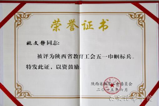 2015年,姚文静副校长被授予“陕西省教育工会五一巾帼标兵” 荣誉称号