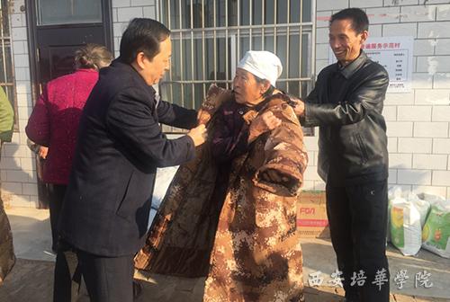西安培华学院党委书记胡俊生为贫困户试穿棉大衣