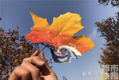 在冬天的校园里,捡上一片树叶,涂涂画画,这是西安培华学院视觉传达专业大二学生李康的主意。