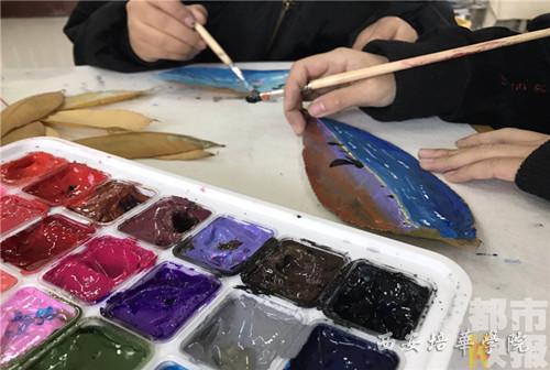 寒冬树叶飘落,色彩单调。但是西安培华学院的学生却用画笔在落叶上描绘出斑斓的世界。