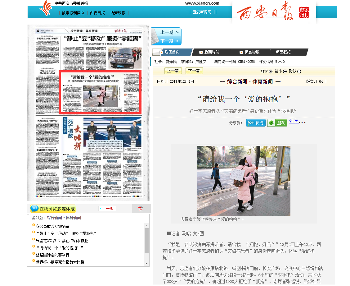 “我是一名艾滋病病毒携带者,请给我一个拥抱,好吗?”12月2日上午10点,西安培华学院的红十字志愿者们以“艾滋病患者”的身份走向街头,体验“爱的抱抱”。