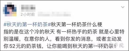 “指的是在这个冷的秋天,有一杯热乎的奶茶,就是心里特别温暖,在意你的人,看到你发的消息,或者主动发你52元的奶茶钱,让你能喝到秋天的第一杯奶茶。”