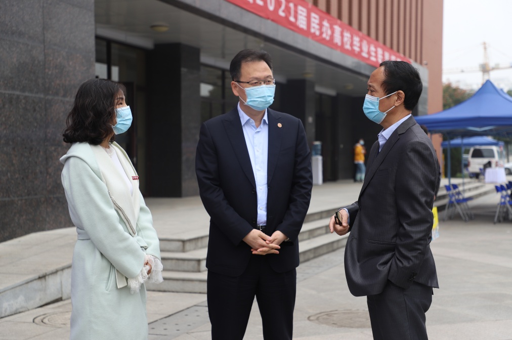招聘会现场,陕西省教育工委、陕西省教育厅一级巡视员朱征南,西安培华学院理事长姜波、校长李映方、党委副书记、副校长姚文静,陕西省教育厅高校学生工作处三级调研员白炀,陕西省高等学校毕业生就业服务中心主任陈靖,西安翻译学院、西安外事学院、西安思源学院等就业部门负责人,学生服务中心、各二级学院领导到现场调研指导。与现场用人单位招聘负责人就招聘单位的人才需求、疫情对于单位招聘工作的影响以及对高校人才培养的意见建议等方面进行沟通。
