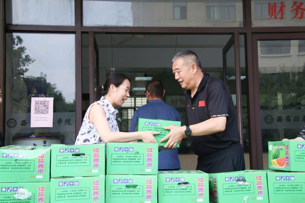 西安培华学院监事会、工会主席徐国富为教职工发放清凉礼包。