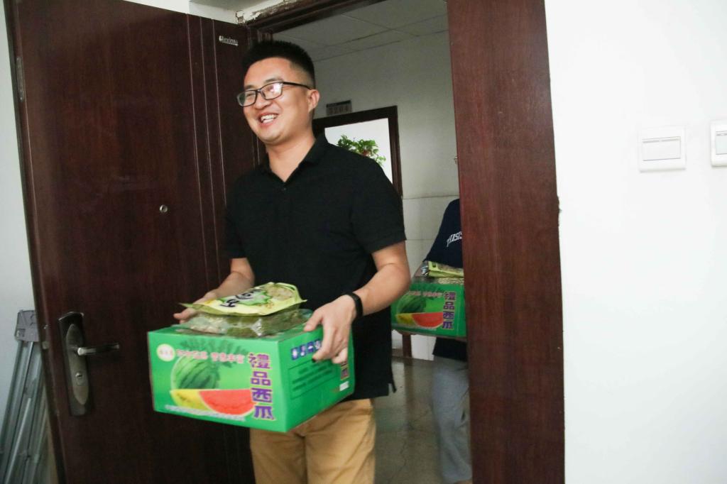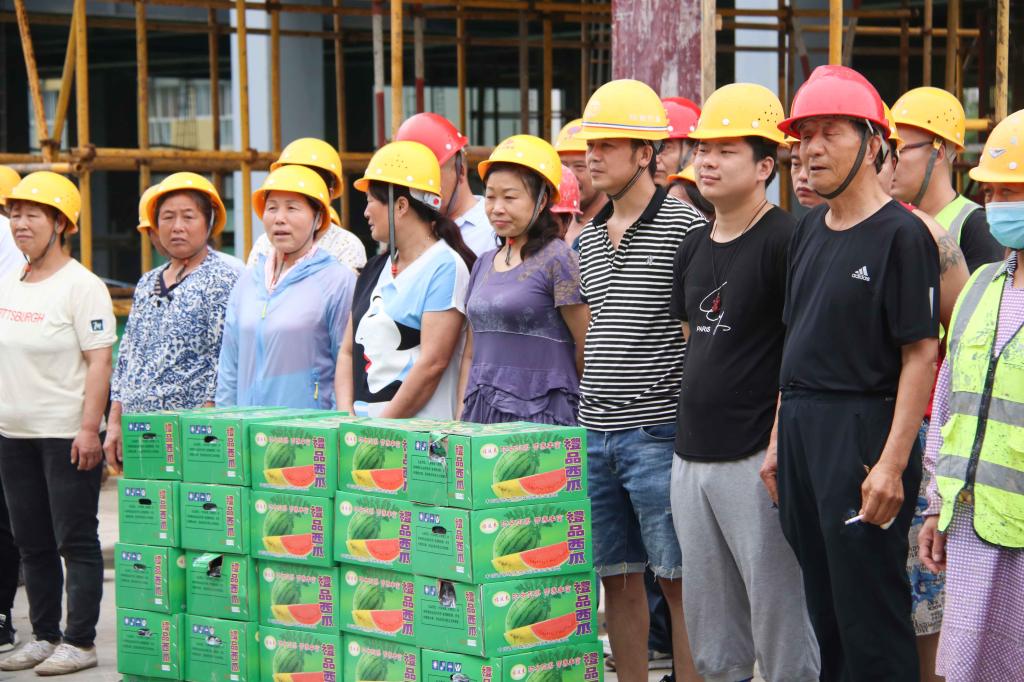 校长助理姜涛将400余斤西瓜等降温物资,送到了奋战在高温一线的基建人员手中,向他们表达祝福和感谢,并叮嘱工人时刻牢记高温季节施工安全注意事项,防止安全事故和高温中暑事件发生,确保人身安全。