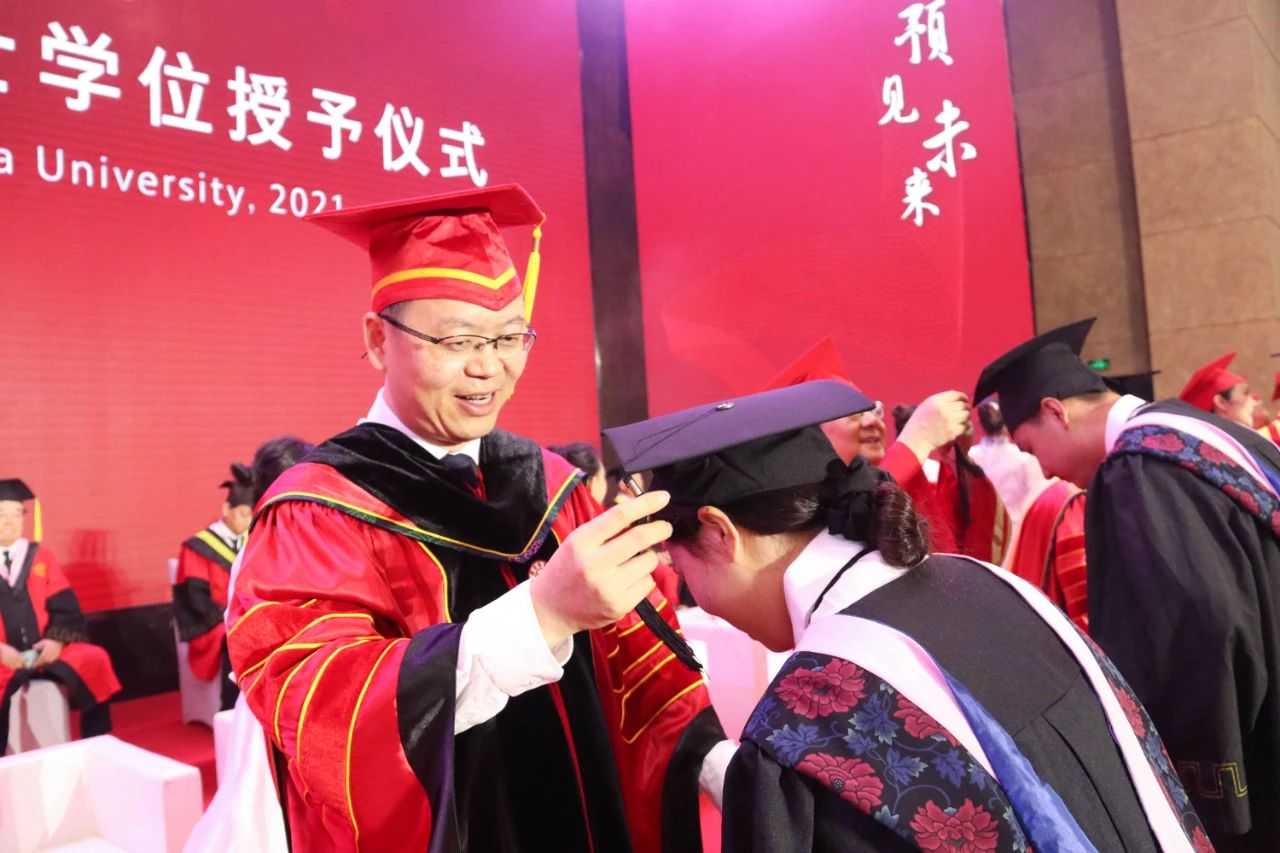 校领导为毕业生代表颁发毕业证书、学位证书并授礼。接过毕业证书、与师长合影,毕业帽穗从右侧拨到左侧……郑重的仪式、荣耀的见证,毕业生们迎来了人生中的“完美时刻”。