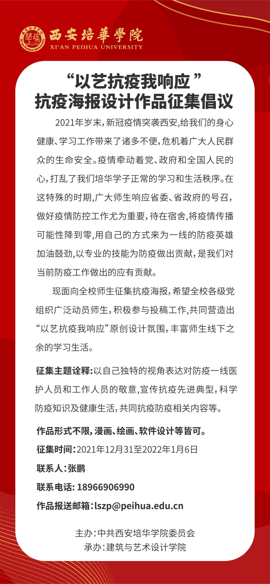 近日,由中共西安培华学院委员会主办,建筑与艺术设计学院承办的“以艺抗疫 我响应”抗疫海报设计作品征集活动落下帷幕,经过评审老师们的层层筛选,共有多幅作品入围本次比赛,以下为部分入围优秀作品。