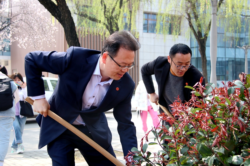 植树活动现场,理事长及各位校领导一起挥锹平土,扶正树苗,填土夯苗,种下了一棵棵绿油油的树苗,植树造林是创造高品质校园环境,加快建设美丽校园的实际行动。提高了师生义务植树的意识,和爱护花木,珍惜绿色的责任心。
