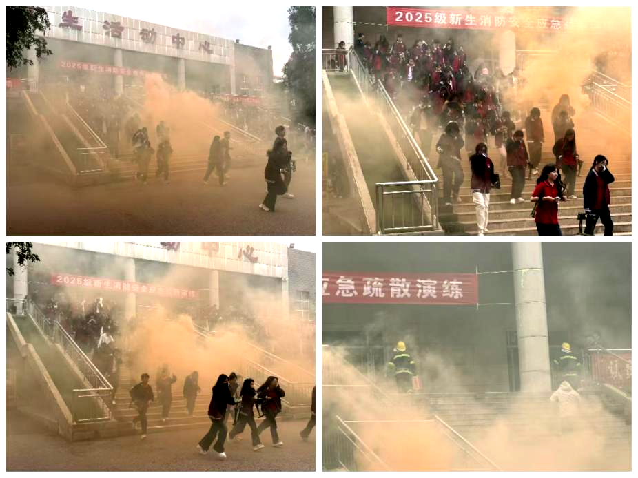 随后进行应急疏散演练,模拟火灾警报触发后,学生社区现场升起浓烟。在工作人员的统一指引下,新生们迅速用湿毛巾捂住口鼻,沿安全通道弯腰低姿有序撤离,快速抵达指定安全区域,全程紧张有序、配合默契。