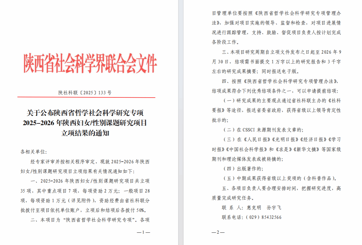 近日,陕西省哲学社会科学研究专项2025-2026年陕西妇女/性别课题研究项目立项结果公布,学校获批3项研究项目,其中重点项目2项、一般项目1项。成为在此项目当中唯一获得重点项目立项的省属民办本科高校。