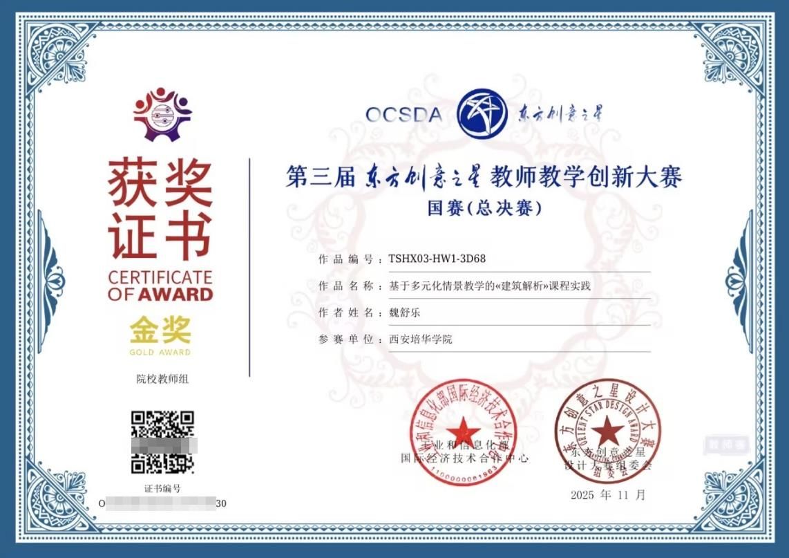 近日,东方创意之星教师教学创新大赛总决赛传来捷报,西安培华学院智能科学与工程学院魏舒乐老师的《基于多元化情景教学的〈建筑解析〉课程实践》项目,在课程赛道激烈角逐中脱颖而出,成功斩获国家级金奖!充分展现了培华教师队伍的教学实力与创新风采。