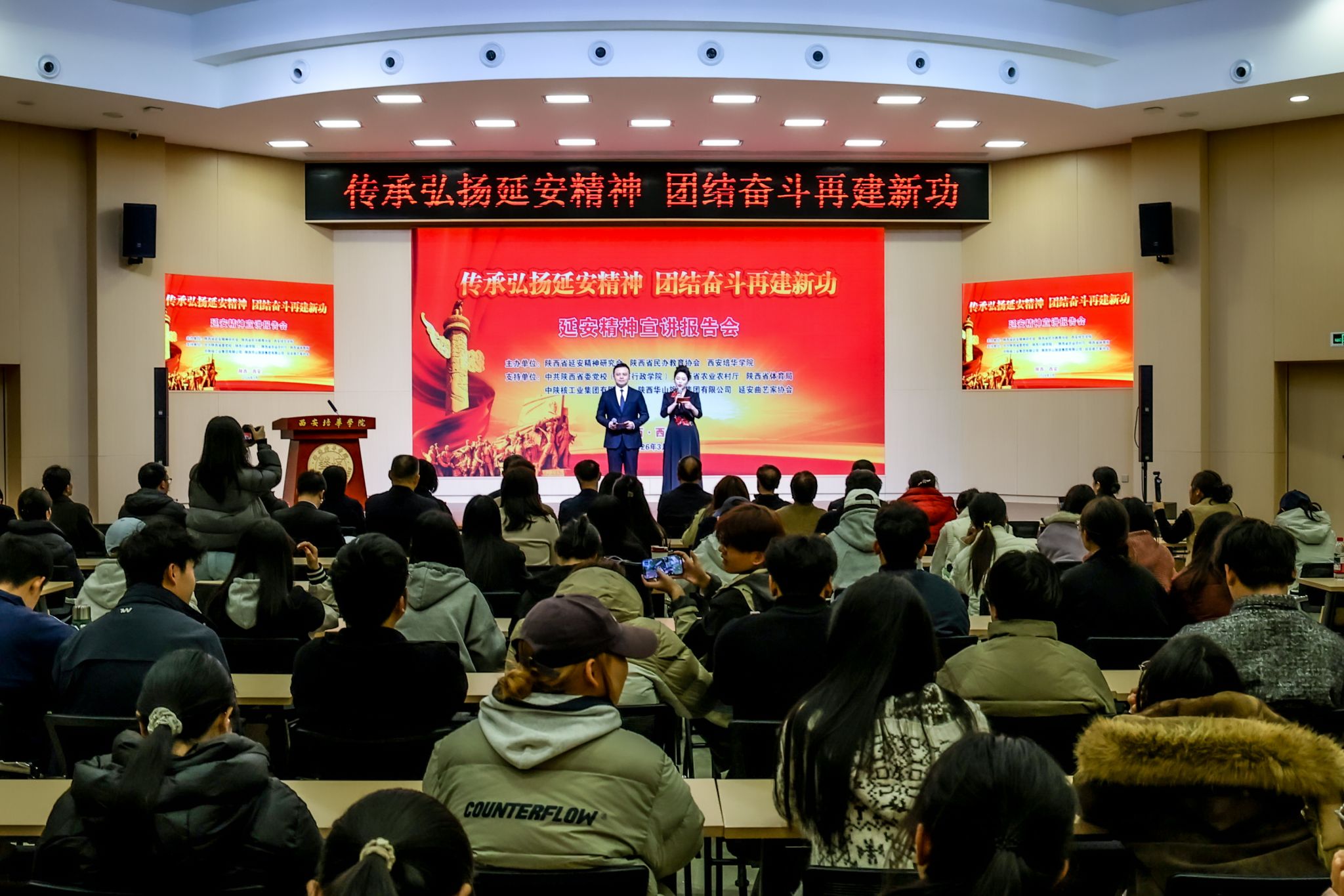 西安培华学院党委书记刘锋致欢迎词。他表示,延安精神是我们党的宝贵精神财富,是立德树人、办好大思政课的鲜活教材。学校将以此次宣讲为契机,将红色资源融入育人全过程,推动延安精神进校园、进课堂、进头脑。他希望师生在宣讲中感悟信仰力量、赓续红色血脉,在新时代新征程上团结奋斗、再建新功。