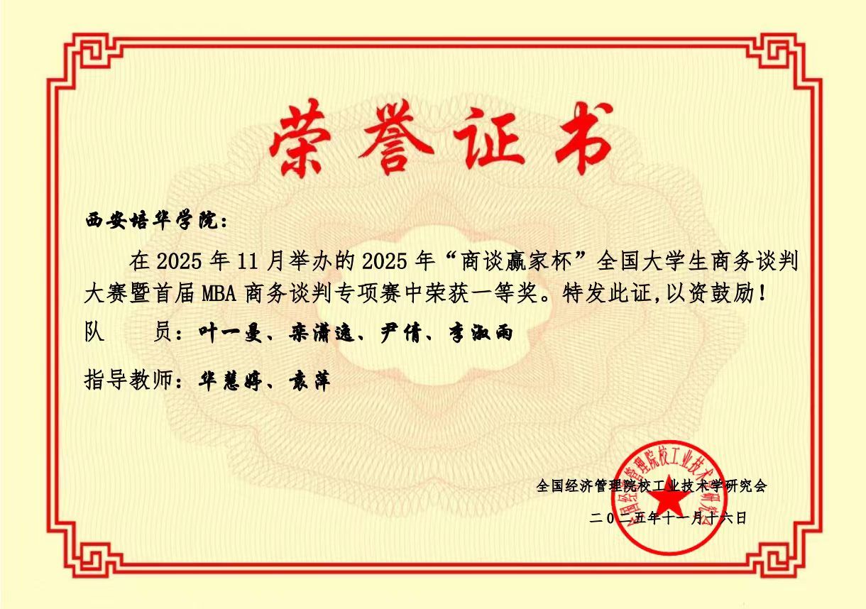 2025年“商谈赢家杯”全国大学生商务谈判大赛全国总决赛圆满落幕。西安培华学院会计与金融学院2024级金融工程专业4名本科生组成的参赛团队,在全国近300支队伍中脱颖而出,成功斩获全国一等奖,展现了培华学子的硬核实力。