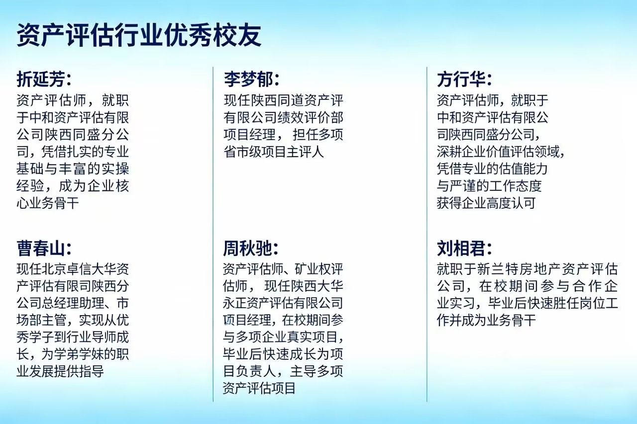 资产评估专业属于管理学门类下的工商管理类,学制四年,授予管理学学士学位。专业立足陕西、服务西部、面向全国,精准对接多层次资本市场建设、数字经济发展与西部产业升级的核心需求,以“产教融合、应用导向、实践强化”为原则,致力于培养具备扎实的经济学、管理学基础,熟练掌握资产评估、财务会计、大数据分析等核心技能,兼具定性与定量分析能力、国际视野与职业素养,能胜任企业价值评估、数据资产评估、房地产评估、矿业权评估等传统与新兴领域工作的高素质应用型评估人才。