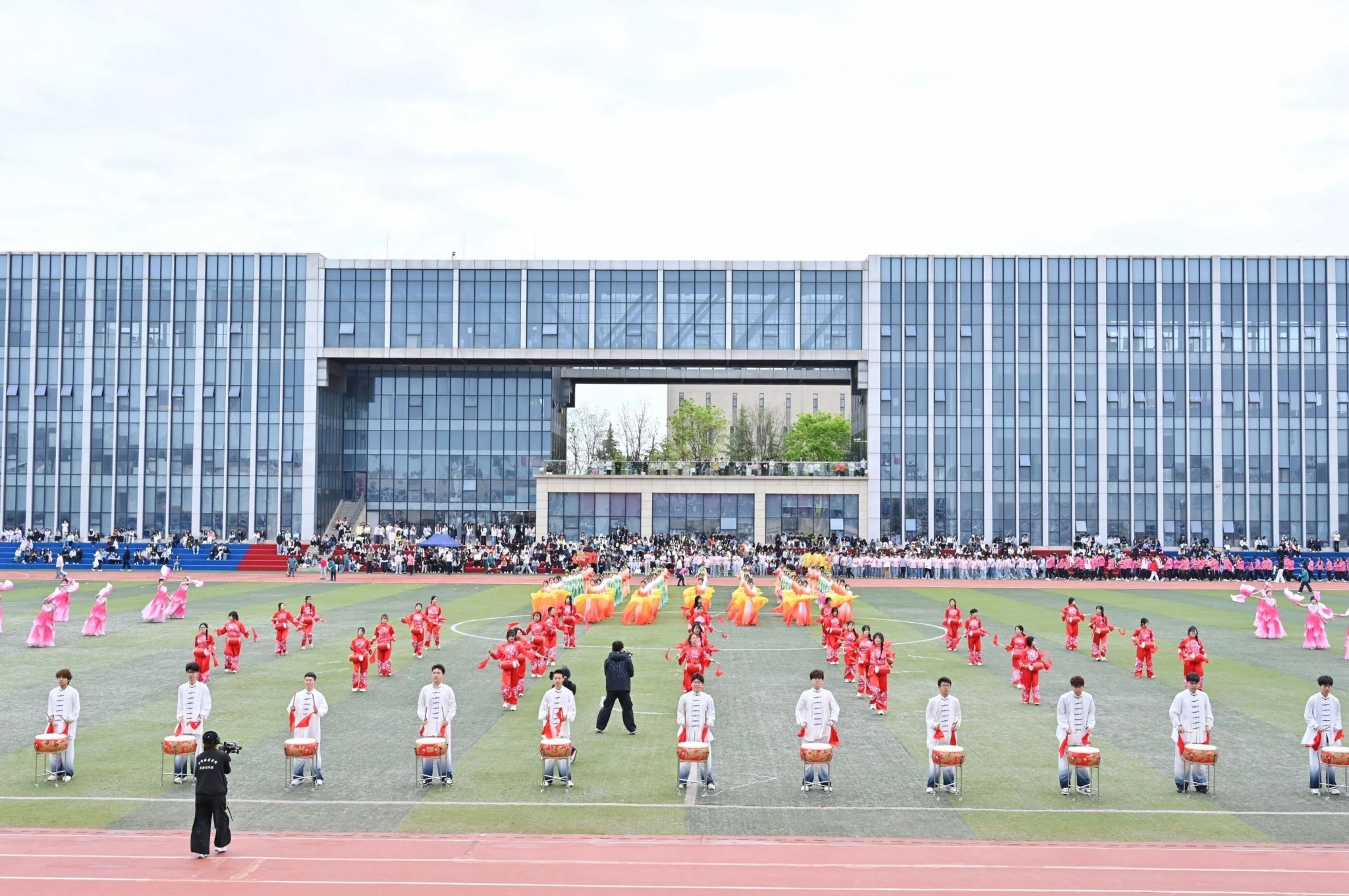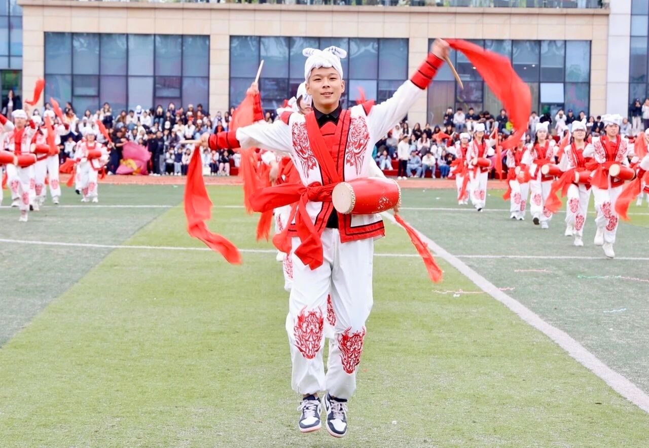 入场式视觉盛宴后,方阵表演将气氛推向顶点——老师们以《让我们一起出发》团队协作默契满分,欢笑汗水交织拉开最燃序幕;医学院《医韵青春,律动健康》动作如手术刀精准,医者仁心与青春活力完美交融;法学院《光亮》扇子开合似法典翻卷,舞步起落如正义天平,法治信仰随扇舞流淌;智工院队形变换如精密算法,智慧与汗水共振;国际教育学院《赤子风华,奔向寰宇》多元文化交融,世界眼光绽放;传媒与设计学院《横山腰鼓》以鼓为媒、以舞为翼,黄土地热情燃爆全场;文学院《礼乐华章》折扇开合如史册翻卷,舞步起落似山河泼墨,书写最美青春华章;会计与金融学院《盛世欢歌》以欢歌笑语献上盛世盛宴;体育学院《龙狮舞动,同心筑梦》舞龙舞狮踏浪掀高潮,动感节拍点燃全场,将开幕式推向最高潮。
