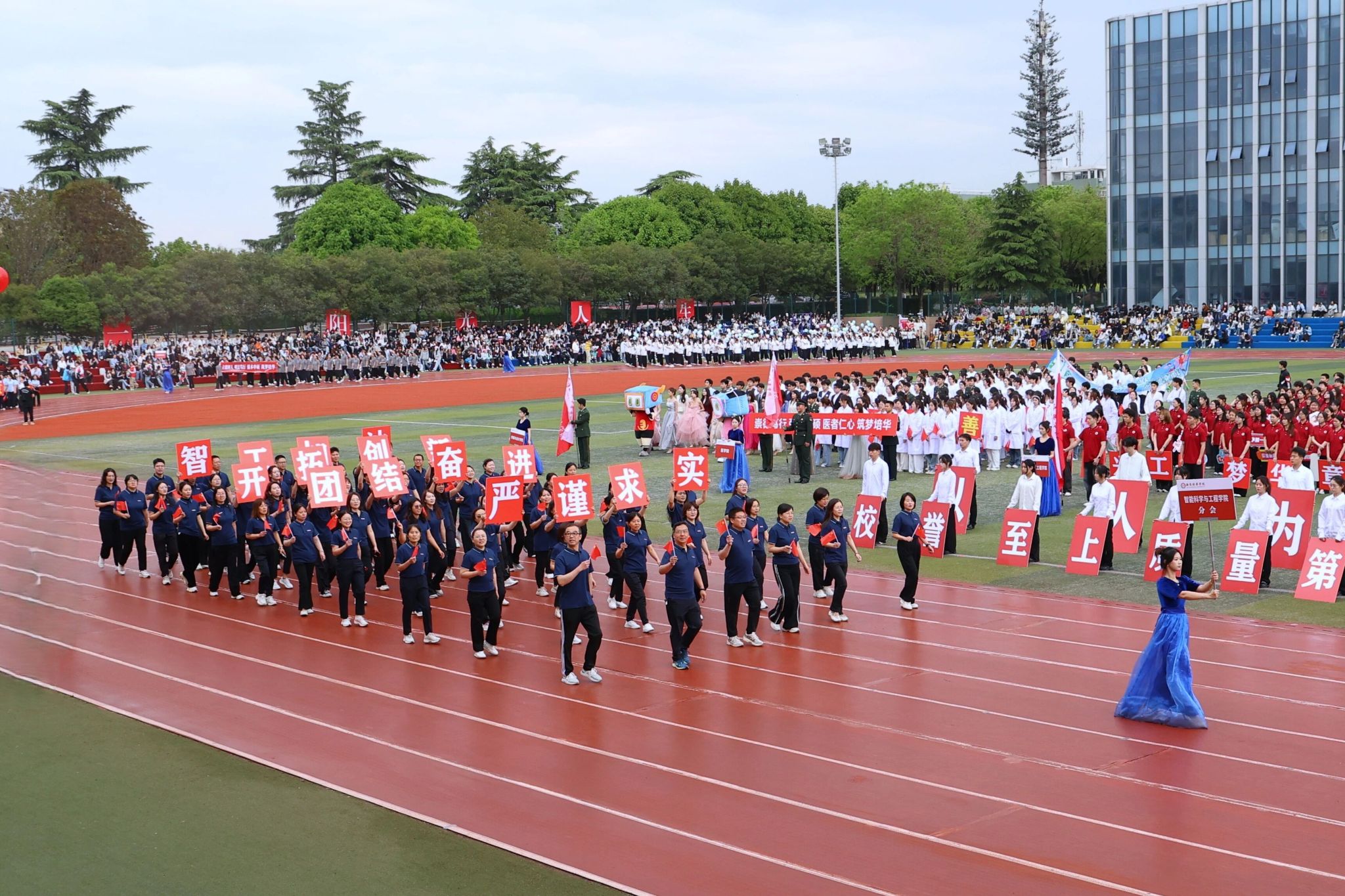 智能科学与工程学院以“智行天下,能创未来”为旗,严谨与朝气并存,智慧与汗水碰撞;国际教育学院踏着青春节拍走来,融通中外,教育未来,赛场书写拼搏篇章;医学院学子白大褂作“战袍”,步伐铿锵、眼神坚定,将“医者仁心”使命带上绿茵场;法学院研习法理、秉持理性,用拼搏诠释热爱;传媒与设计学院以横山腰鼓为媒,《横山腰鼓》表演敲响时代强音,镜头捕捉青春,创意点亮赛场;会计与金融学院汇聚国奖、竞赛、实践优秀学子,精神昂扬紧随“强本申硕”步伐;文学院奖学金学子儒雅大气,以笔墨为翼、书香为魂,步履铿锵展青春榜样;体育学院七大运动专项学子龙狮舞动,《龙狮舞动,同心筑梦》将开幕式推向高潮,“强国有我”信念刻进骨血;女子学院“自尊、自信、自立、自强”,铿锵玫瑰璀璨绽放;培华职业高中师生同心,学子朝气蓬勃,教师言传身教,共展奋进风貌。