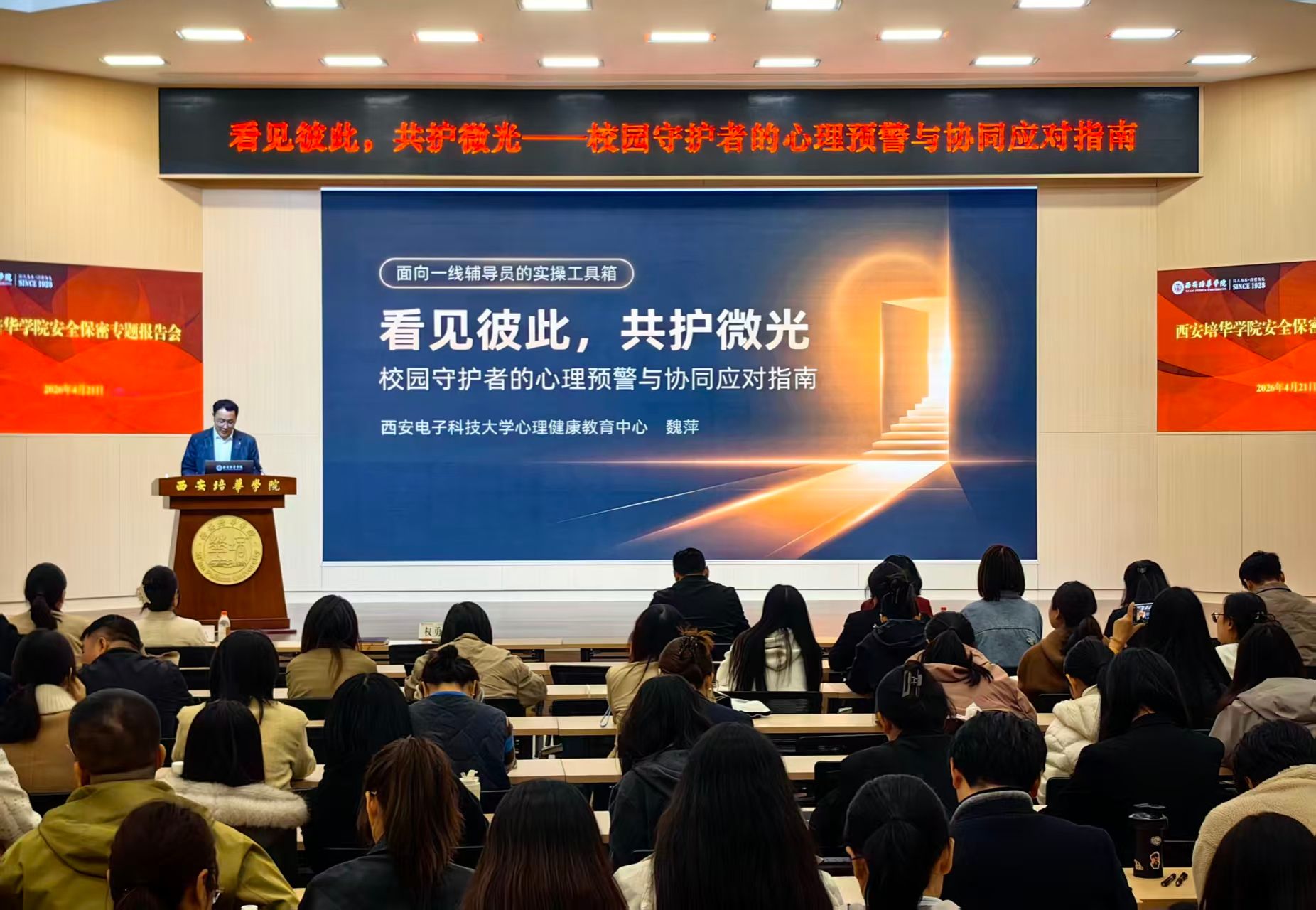 为深入推进学校心理健康教育工作,切实提升辅导员专业素养与工作能力,4月21日下午,学校举办“看见彼此,共护微光—校园守护者的心理预警与协同应对指南”专题培训,学校邀请西安电子科技大学心理健康教育中心主任魏萍教授担任主讲。培训由学工部部长权勇太主持。