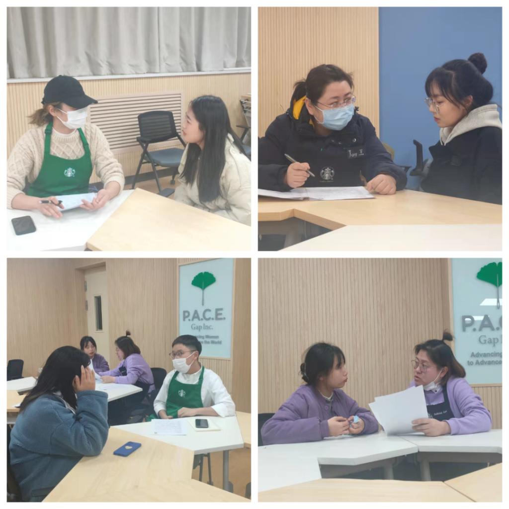 接下来由星巴克的几位门店经理,对同学们进行了一对一的面试。面试官认真负责的对待每一位同学,通过和同学们的交谈,了解同学们的特点,从中选择星巴克所需的人才。