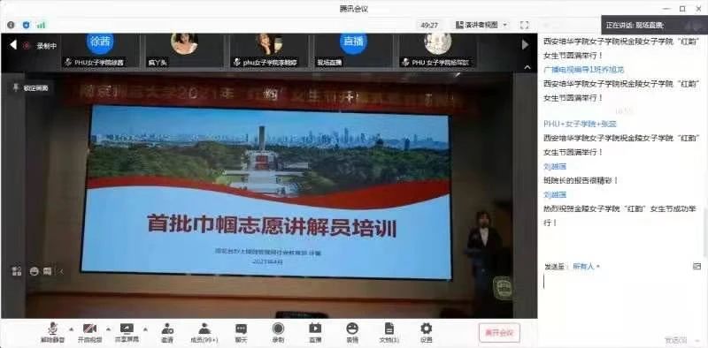 与此同时,西安培华学院学术委员会主席、副校长刘越莲,西安培华学院女子学院副院长、国际交流中心主任王鹏,女子学院全体教师,女子学院2019级全体学生通过腾讯会议线上直播,一同参与到这次活动,一起聆听、学习。