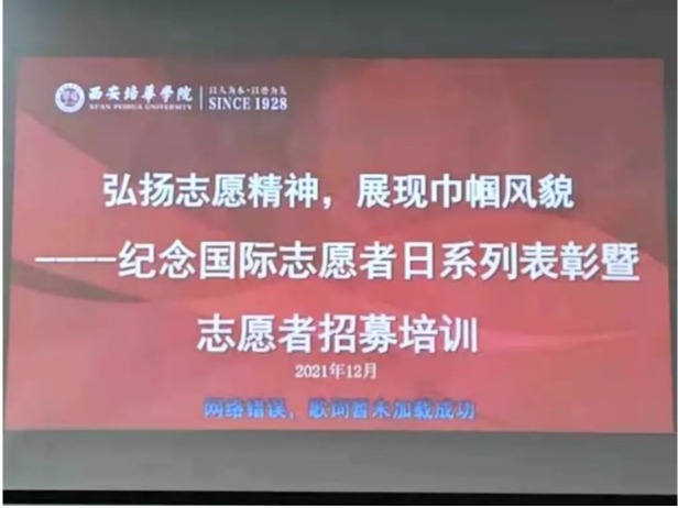 为进一步落实中央文明委关于新时代文明实践活动的重要指示,在第36个“国际志愿者日”来临之际,西安培华学院女子学院为弘扬“奉献、友爱、互助、进步”的志愿精神,激励志愿者为社会和谐进步做出更大的贡献,于2021年12月2日下午在3503教室举行纪念活动暨志愿服务证书颁发仪式,并进行寒假志愿者招募及志愿服务基础知识培训活动。