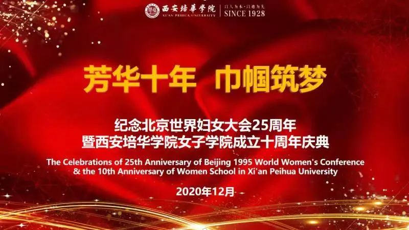 2020年12月18日下午,“芳华十年,巾帼筑梦”纪念北京世界妇女大会25周年暨西安培华学院女子学院成立十周年庆典在维之图书馆报告厅隆重举行。