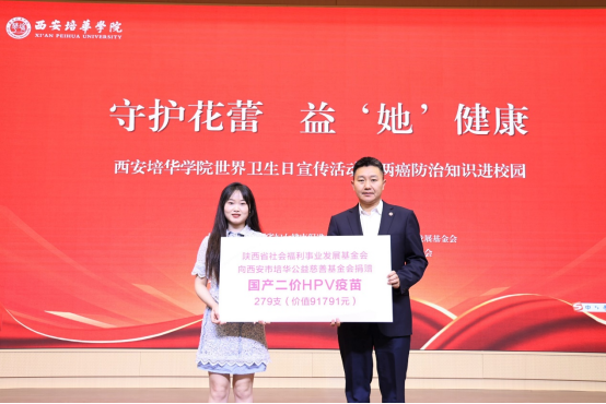 活动现场,厦门万泰沧海生物技术有限公司向西安培华学院女子学院学生捐赠价值玖万壹仟柒佰玖拾壹元(279支)的二价HPV疫苗。公司西北大区负责人王美玲表示:“我们深知高校在健康科普中的重要作用,此次捐赠是希望助力西安培华学院打造女性健康教育的示范项目,企业有责任回馈社会,我们愿与高校携手,为女性健康事业贡献力量!”