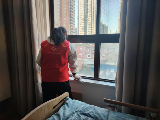 养老院平常的工作也是繁多的,志愿者们也都与工作人员们一起积极投身于劳动之中,首先房间里的床架、柜子、窗台……这些都是老人们平时生活必须回触碰的地方,所以这些地方都会清理多次,以防止有细菌病毒给老人们造成困扰,其次还有楼道外的扶手,老人们大多行动不便,有些在拄拐的同时还会用手扶着栏杆,所以这里也是重中之重,志愿者们听工作人员细细讲解,认真的记下工作内容后就马不停蹄的去拿工具,打扫卫生,志愿者们三三两两相互配合,所到之处都干干净净,焕然一新,夹缝里的灰尘都被带走,不一会儿房间内的设施都擦拭完毕,在活动区内还有几名志愿者认真仔细的清理着柜子,细致又专注,为养老院带来了一道靓丽的风景。大家打扫完后看到劳动成果后都表示很满意。