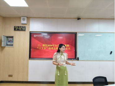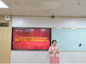 接着,由女子学院张文悦老师宣读《2024年暑期“三下乡”优秀志愿者表彰决定》。张老师表示,希望本次受表彰的团队能够继续坚持无私的奉献精神、顽强的拼搏意志和卓越的创新能力,并且希望同学们珍惜这份荣誉,在未来的学习和生活中继续发扬这种精神,同时也希望女院学子以他们为榜样,积极投身社会实践活动,为社会发展贡献出青年大学生一份力量。