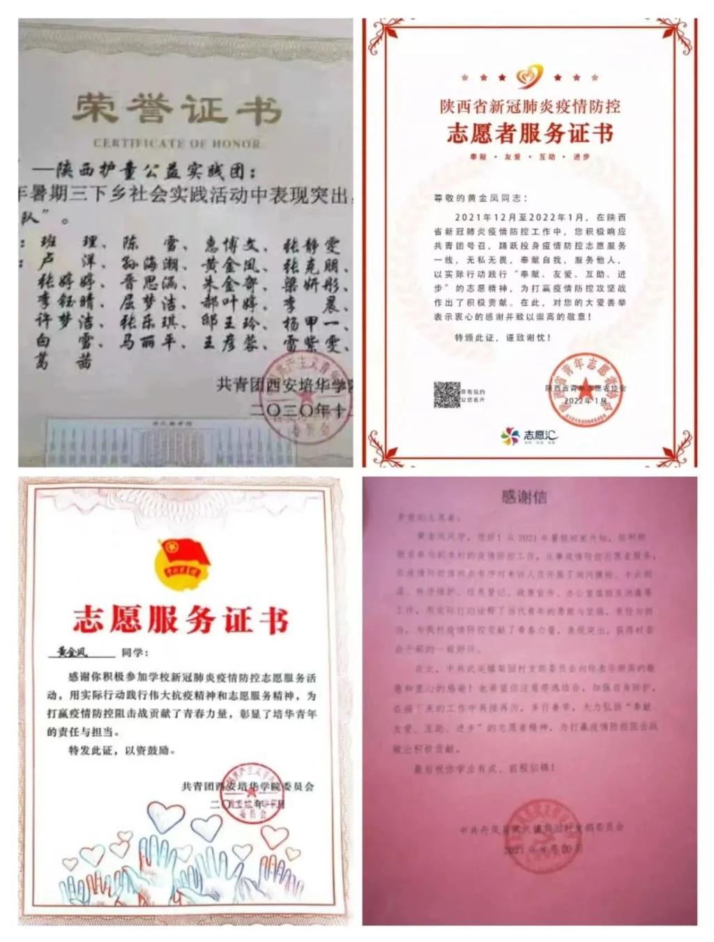 在班理院长的带领下组织并开展了女子学院暑期三下乡活动——小土豆儿童服务站支教服务活动,获得校级暑期三下乡优秀团队以及优秀志愿者;疫情期间,积极投身于志愿者的队伍中,获得陕西省新冠肺炎疫情防控志愿者服务证书以及校级优秀志愿者证书。