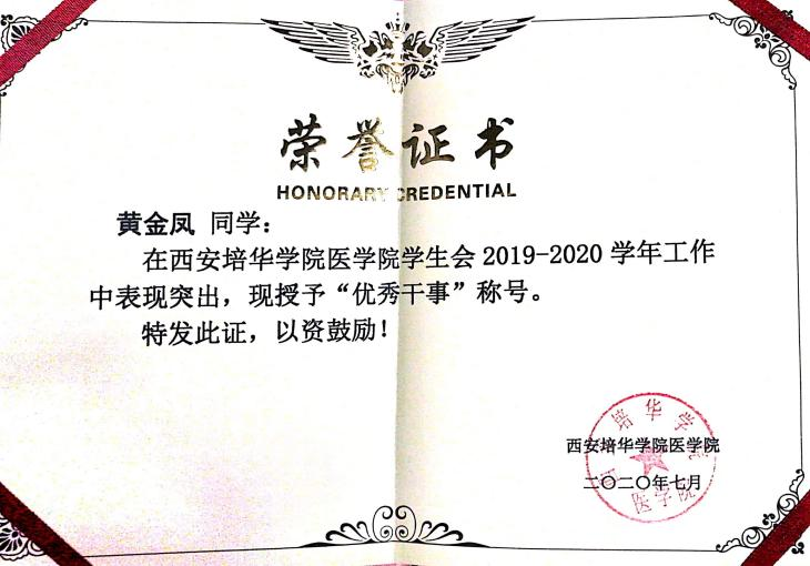 黄金凤,女,中共党员,女子班班长,医学院护理学专业19级学生,曾任西安培华学院女生会运营部主任。