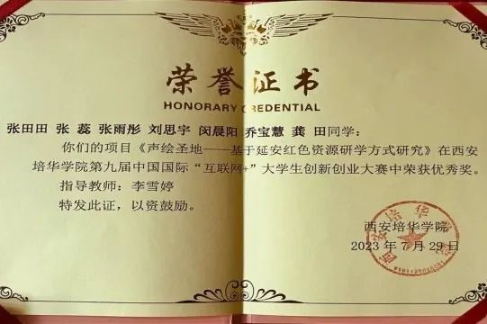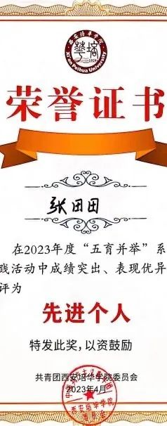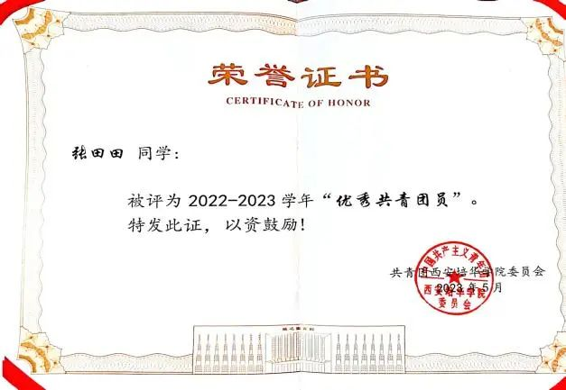 本学年中被授予“优秀共青团员”荣誉称号,考取了普通话二甲证书,“五育并举”中获得“优秀先进个人”称号,大学生创新创业大赛中项目《声绘圣地——基于延安红色资源的研学教育研究》获省级立项,互联网+大赛获优秀奖,三下乡“优秀个人”,大学生讲思政课一等奖,被陕西省红凤协会评为“优秀志愿者”。