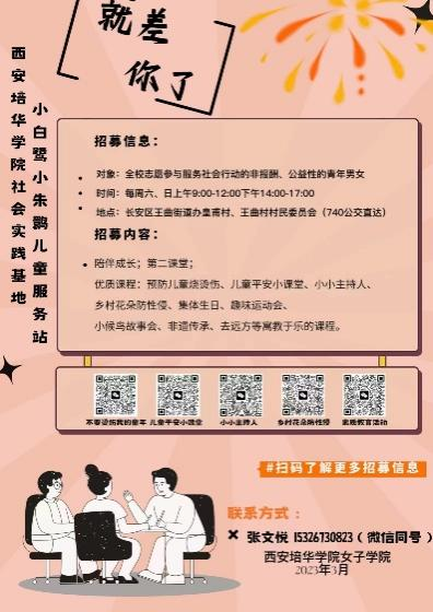 在西安培华学院团委、学生服务中心大力支持下。各二级学院的所有辅导员在班会上介绍了志愿服务场所---由陕西省红凤工程志愿者协会建在长安区王曲街道办皇甫村小白鹭,王曲村小朱鹮儿童服务站的情况,并号召同学们积极参与,以志愿服务的行动,投入到第二个中华民族伟大复兴的战略任务--乡村振兴的伟大实践中去。西安培华学院女子学院创办的芳华巾帼志愿服务管理团队,负责这次招募的具体工作,她们精心设计制作海报,并张贴在各个公寓门口的宣传墙上,扩大学雷锋做志愿服务的影响力。