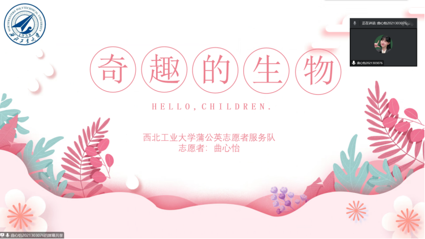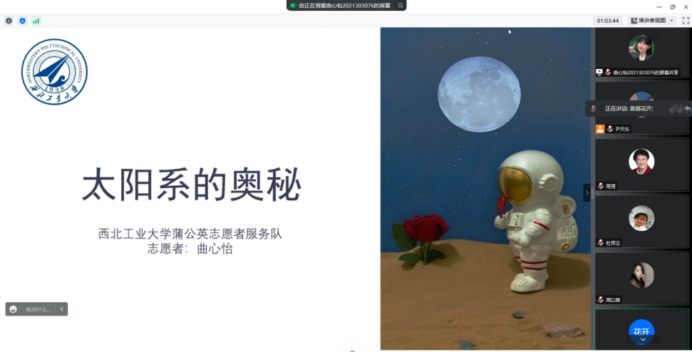 西北工业大学蒲公英志愿者曲心怡为大家带来的课程是:动植物趣味知识科普与太阳系科普,既有地球上生长的动物植物,也有遥远的太阳系里的星球。为丰富教学内容,她通过视频直观地展现了动植物的神奇之处,带领大家领略了奇妙的动植物世界。