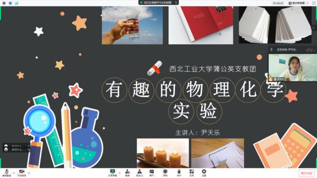 西北工业大学蒲公英志愿者尹天乐为大家带来的课程是有趣的物理化学实验与语文写作课堂。她通过视频与儿童们亲切互动,完成了“杯子里的水”“魔书”“神奇的纸巾”“点燃白烟”等等有趣的家庭科学实验。运用简单易行的操作工具,带领孩子走入物理化学的大门,激发他们对科学实验的兴趣,特别强调了做实验时安全的重要性,必须要在家长的监督下实验。
