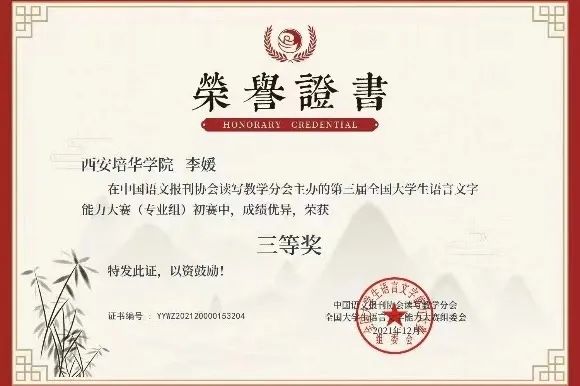 她认真踏实,勤学苦练,刻苦钻研专业知识,严格要求自己学好各项专业知识及相关基础知识,并且取得可人的成绩,全班第五,在全级九百多人中排名五十四。同时在空闲时间还会参加学科竞赛,获得全国语文文字能力大赛初赛三等奖,以及普通话二甲证书。