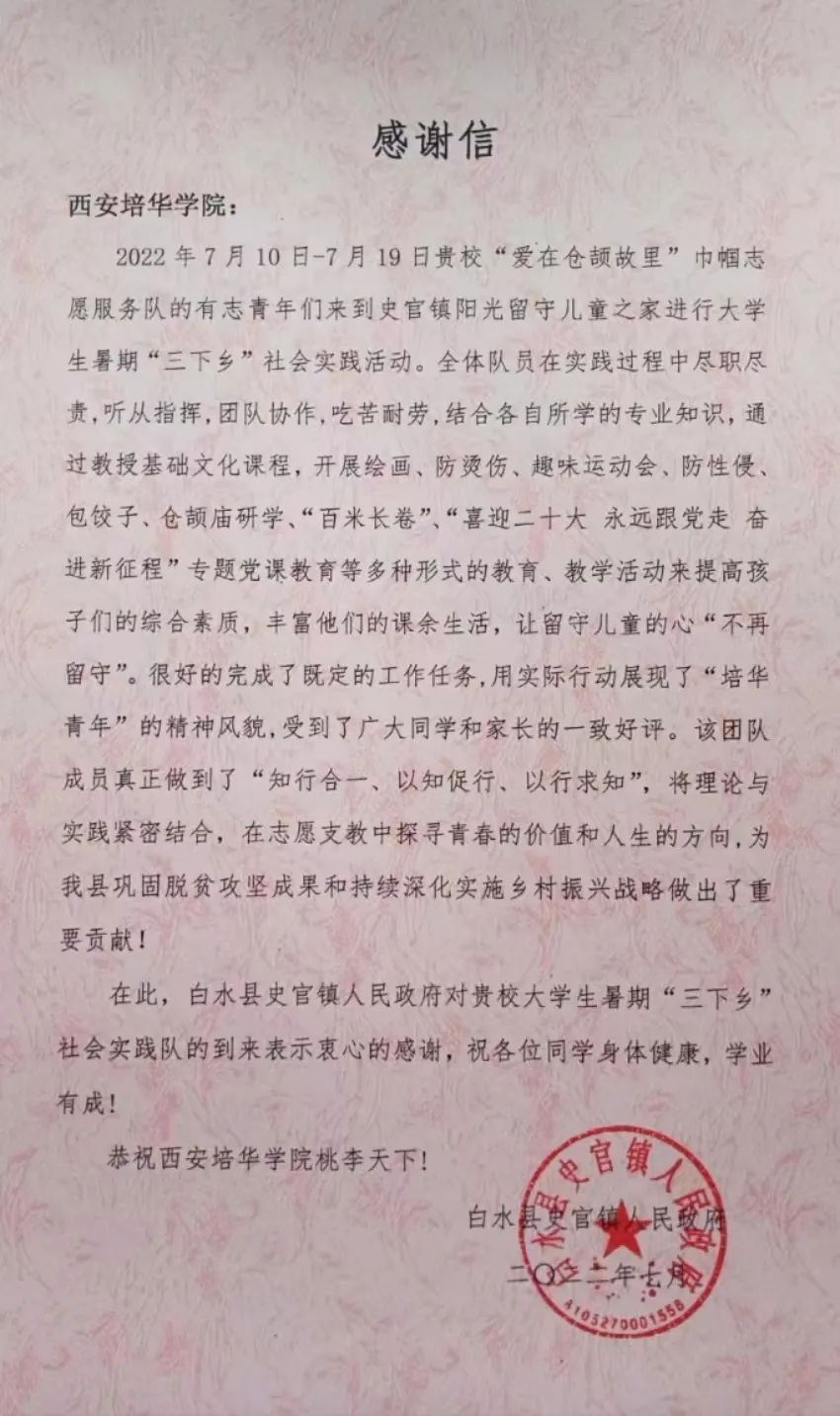 西安培华学院女子学院学生李凤是团队队长,积极协调,组织开展活动,女子学院学生赵萌萌认真备课,为史官镇留守儿童开展四、五年级课程教学,活动深受当地政府认可,白水县史官镇人民政府发来感谢信。