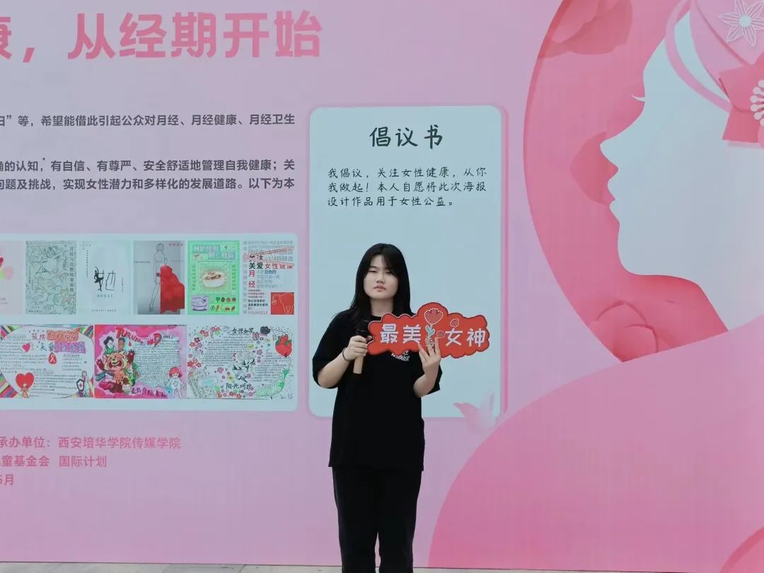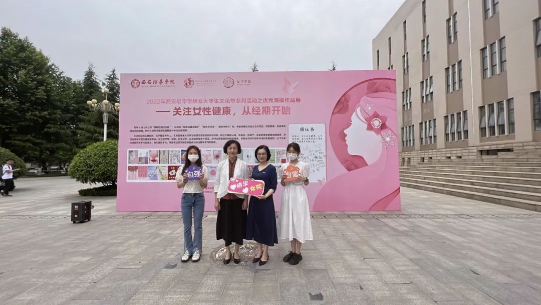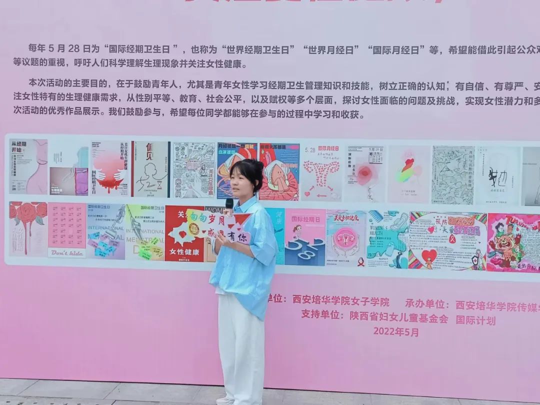5月27日上午12点10分,西安培华学院在图书馆门口广场举办“关注女性健康,从经期开始”优秀海报作品展。活动由西安培华学院女子学院院长助理李蒙老师主持,西安培华学院副校长刘越莲、女子学院常务副院长王鹏、副院长班理、女子学院全体教师及学生代表参加