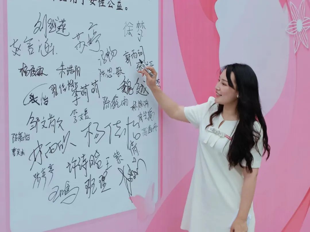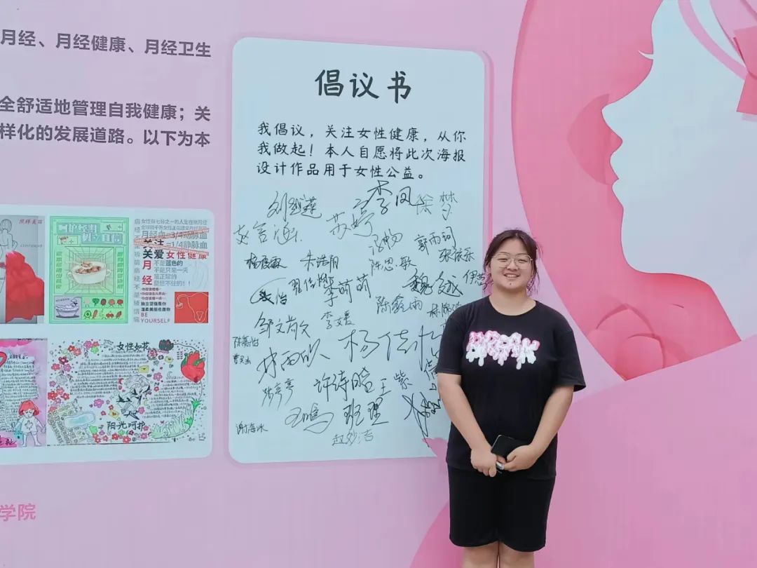 参赛代表们在自己的作品前发出倡议:“关爱女性健康,从你我做起!本人自愿将此次海报设计作品用于女性公益。”并在倡议书上签署姓名。通过参赛,选手们表达自己的创作初心,积极倡导为女性公益贡献自己的一份力量,展现当代大学生风采。