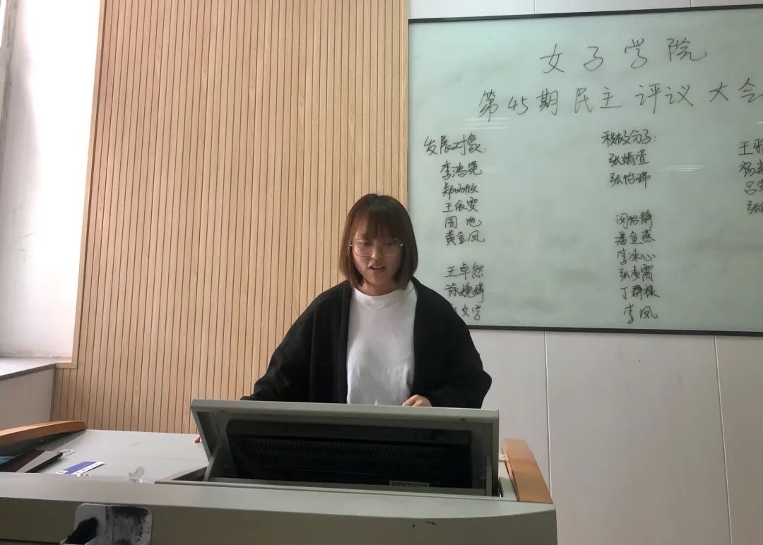 王雅静同学自然大方的向大家进行了自我介绍,回顾了自己在组织的成长过程。和大家分享了自己的成长心得体会,讲述了自己深受党的影响,表露出了渴望接受党组织的教育,成为一名优秀的共产党员。