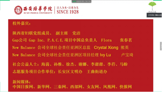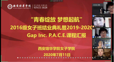 七月,是一个生机勃勃、充满希望的季节又是一个,伴随《踏上未知的旅程》的歌声,带着毕业离别的淡淡忧伤,在7月11日上午9:30这个特殊的日子里,西安培华学院女子学院2016级女子班的结业典礼暨Gap Inc.P.A.C.E.课程汇报在云端如期而至。