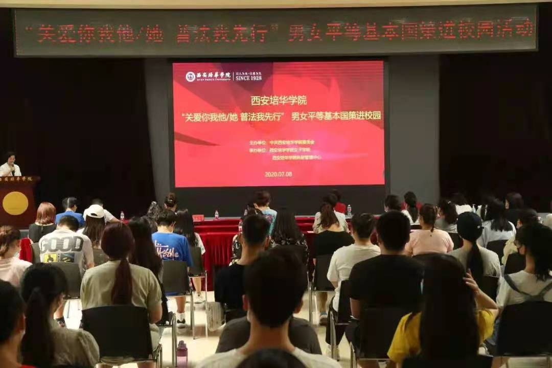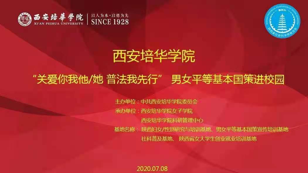 为进一步贯彻落实男女平等基本国策,发挥我校“妇女/性别研究基地”与“社会科学普及基地”的作用。西安培华学院女子学院于7月8日下午在汇知楼阳光厅开展“关爱你我他/她 普法我先行”男女平等基本国策进校园2020年首场主题宣传活动。