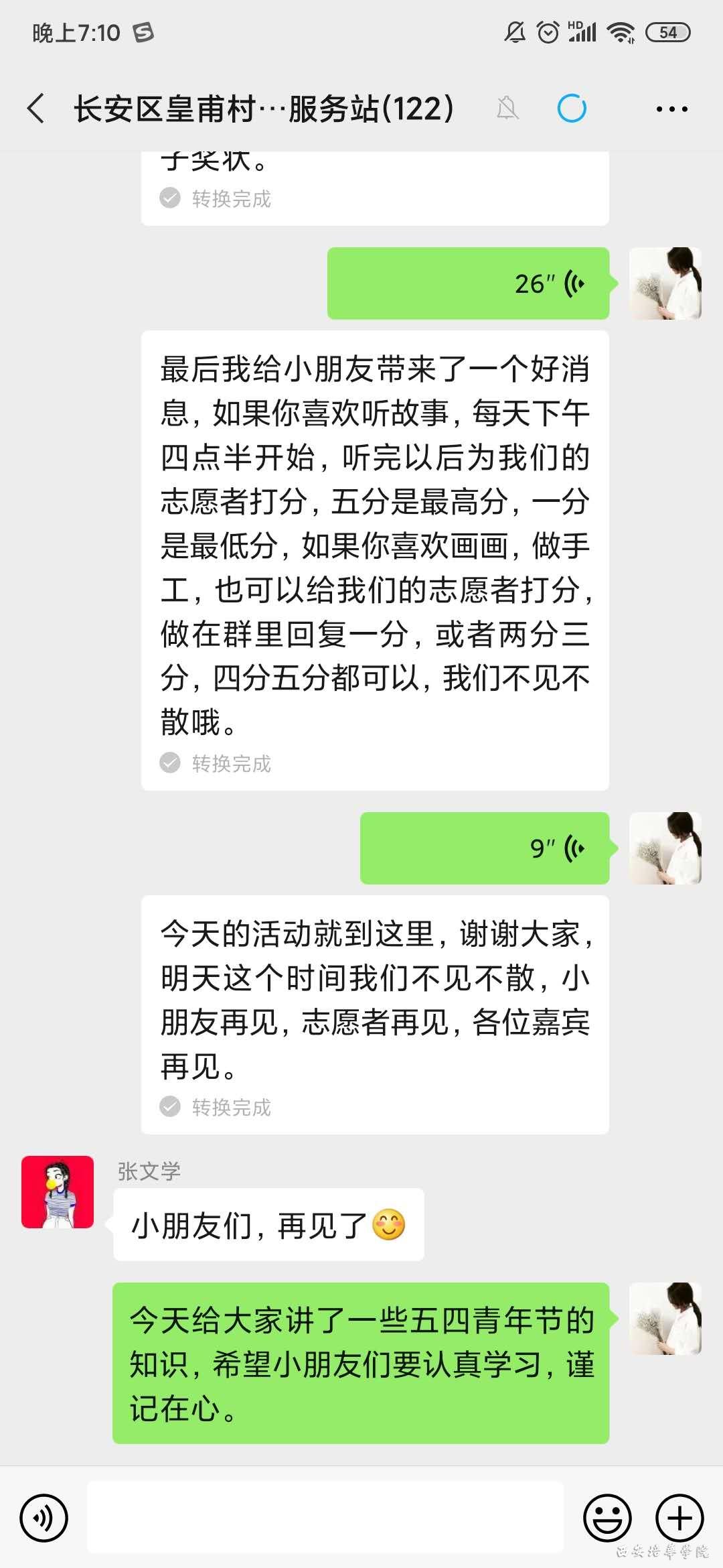 活动开始,由皇甫村儿童服务站的主持人崔海琳,先介绍了到场的嘉宾:长安区区委宣传部副部长、区文明办主任赵晓薇志愿者,长安区文明办副主任杨兴军志愿者,王曲街道办主任崔雅婷、皇甫村妇联主席刘敏,还有红凤工程志愿者协会会长夏雨、小白鹭儿童服务站站长张会婷、小朱鹮儿童服务站站长王敏、西安培华学院女子学院张金霞老师,以及西安培华学院女子学院的四位志愿者。首先,在故事开始之前分享了中国共青团团歌,让他们感受五四精神的体现。