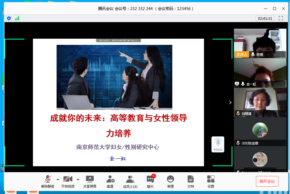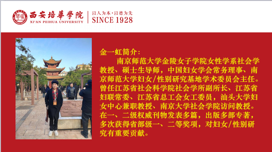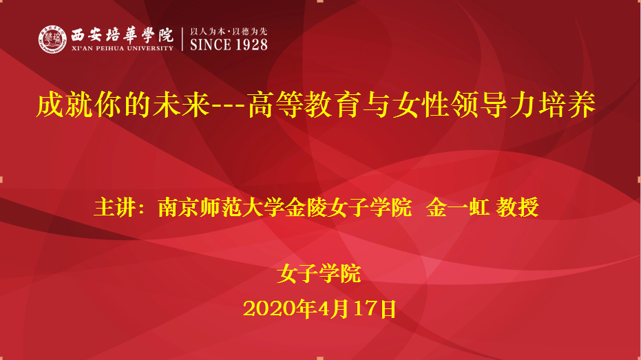在素有创办改革开放第一所女子大学美称的西安培华学院,也经常有人提出以上的问题。为了直面女性成才的必备素质之一---女性领导力如何培养的问题,女子学院特邀请国内资深的妇女/性别研究专家、南京师范大学金陵女子学院的金一虹教授,为广大师生开展了一场“高等教育与女性领导力培养”高水平的讲座。共270余人在线上聆听了此次讲座。
