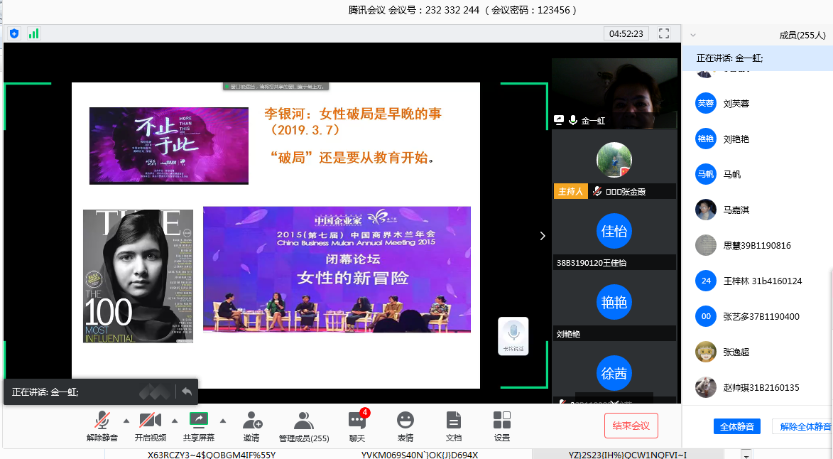 女子学院常务副院长班理最后感谢金教授给我们带来如此重要的精心准备的报告。她认为高校教育过程中,对女性领导力的培养至关重要,是女生走向社会的最重要的加油站,希望广大女生一定要在服务社会、服务社群的自我成长过程中,赋权自己、充实自己、提升自己、在实践中锻炼、使自己的领导力在工作学习的实践中得到提升,将来或者创业、就业,成为自己想活成的模样,为母校培华争光,她也希望受过性别平等教育的男生,学会尊重女性的发展要求,实行联合国倡导的“HeForShe”(他为她)行动,男性女性都要提升自己的领导力,促进社会的和谐发展,彰显迈向百年培华的学子的魄力和魅力。