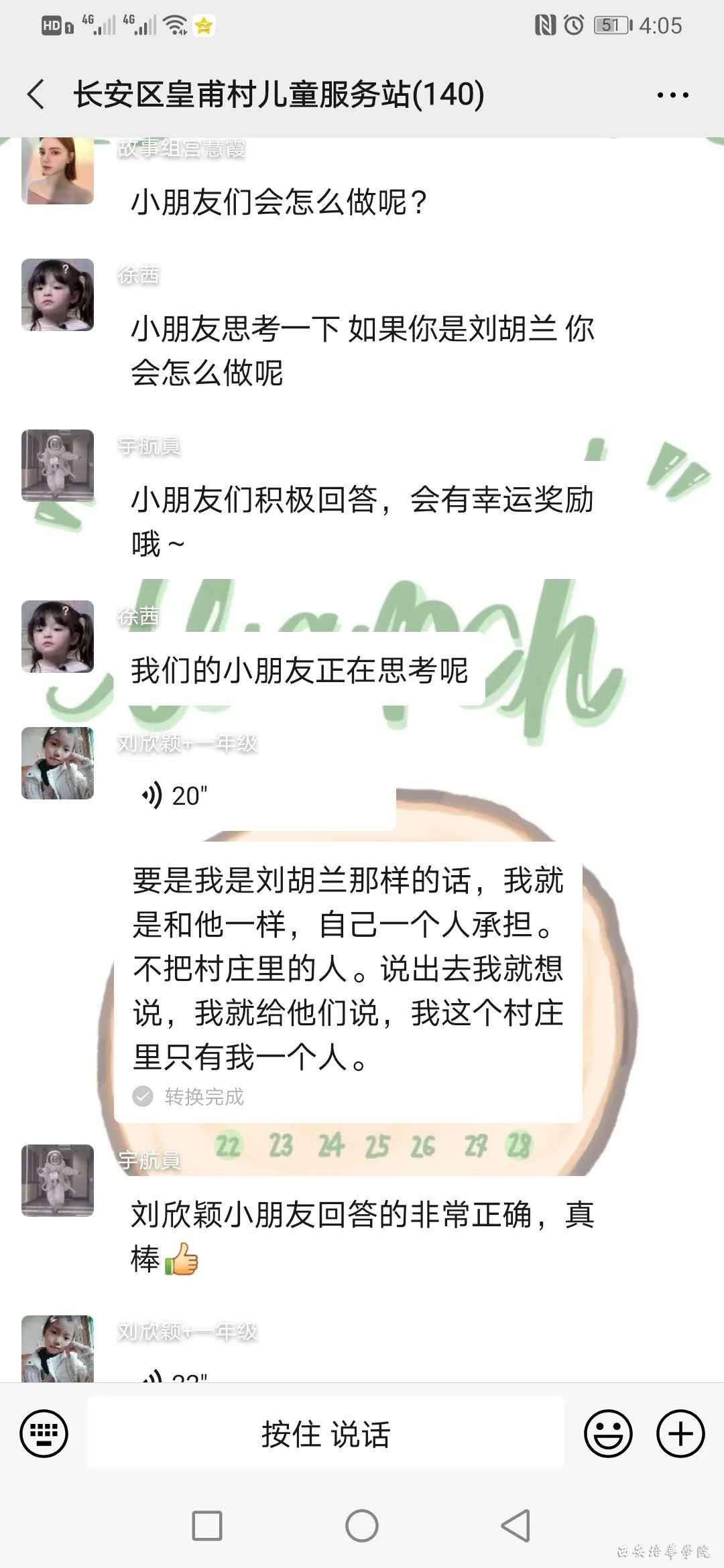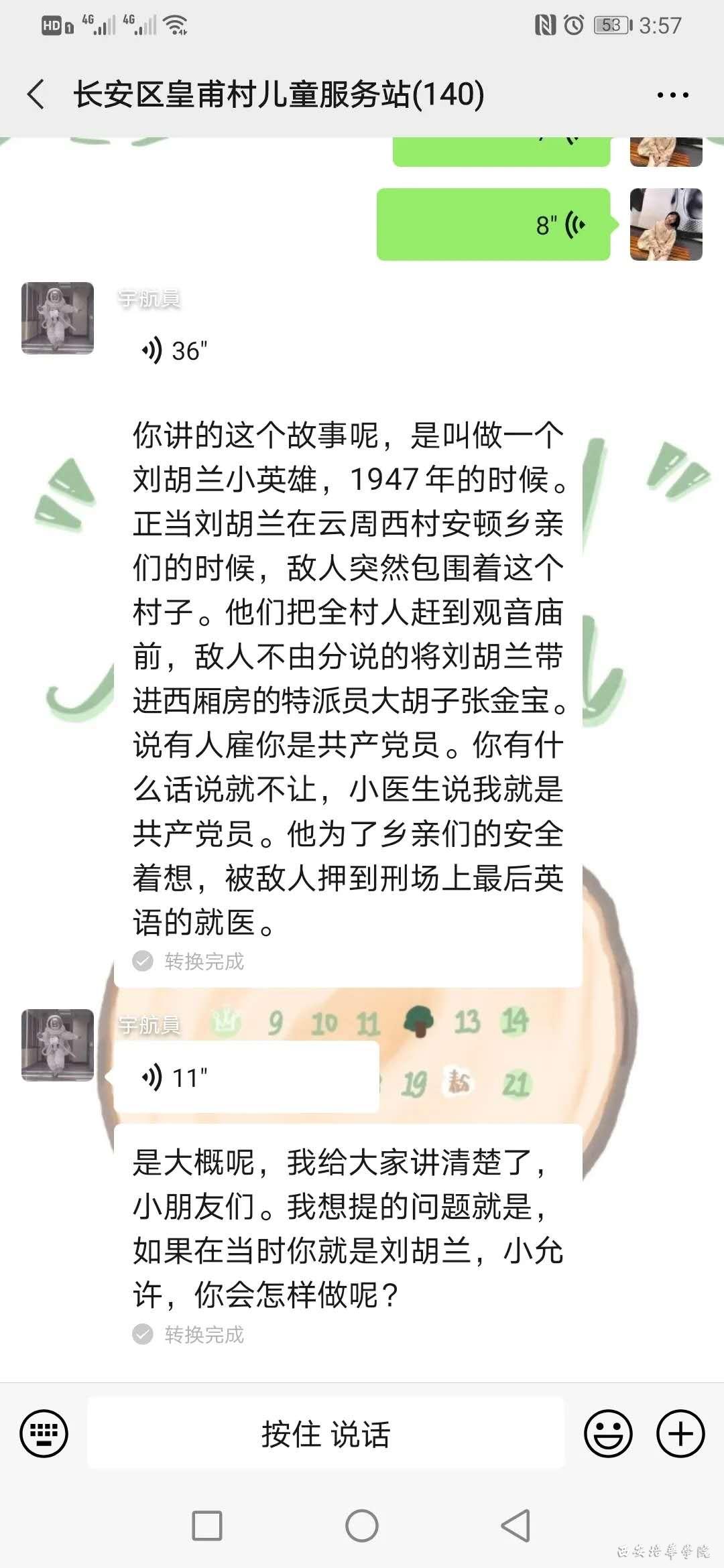 第一个故事是由王敏姐姐带来的《小英雄刘胡兰》,这个故事讲述了刘胡兰在敌人面前勇敢承认自己是共产党,不畏恶势力,用牺牲自己的方式保全了全村人的性命。小朋友们也从这个故事中学到了责任和担当。