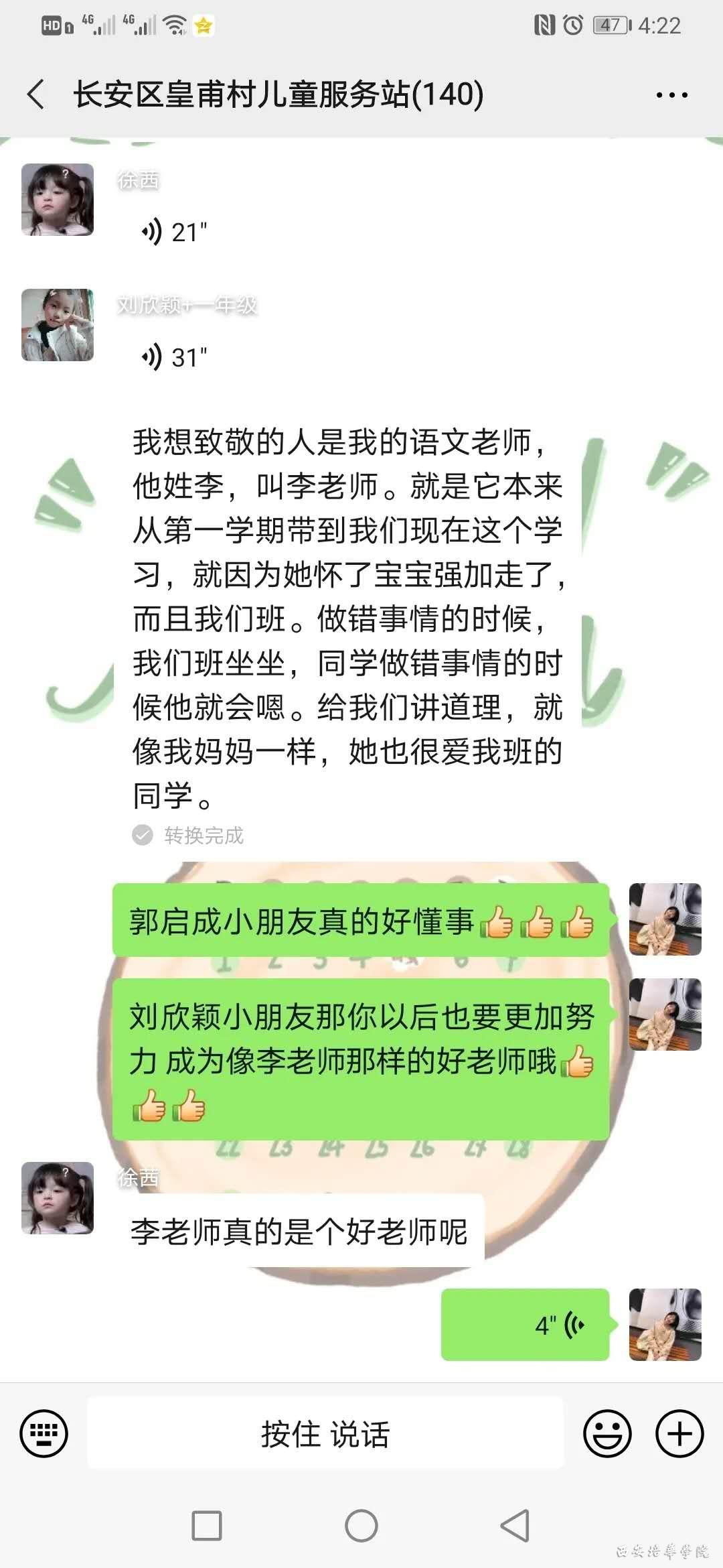我们用心做好每一次的志愿活动,我们用情去打动小朋友,我们用行动来证明我们可以做得更好、更棒!与此同时,也恭喜我们的罗宇晨、刘新莹、刘新颖和郭启成四位小朋友获得我们的才艺展示奖。我们周日组的志愿者都是女生,我们有信心、有耐心、细心的去关照到每一个小朋友。我们用语言赞美:赞美他们的作品、赞美他们的朗诵……