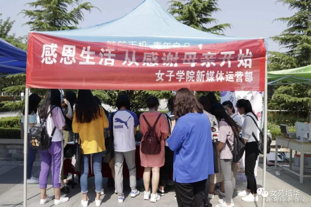 为纪念母亲节这个具有非凡意义的日子的。西安培华学院女子学院于 2018 年 5 月 16日 在综合楼广场举办了感恩母亲系列活动:“感谢生活,从感恩母亲开始”,通过现场活动的开展,加强了学生们的‘三感’(感动、感激、感恩)教育”。