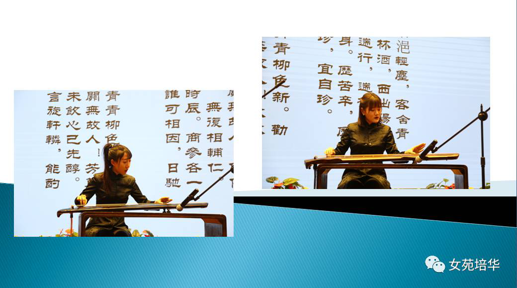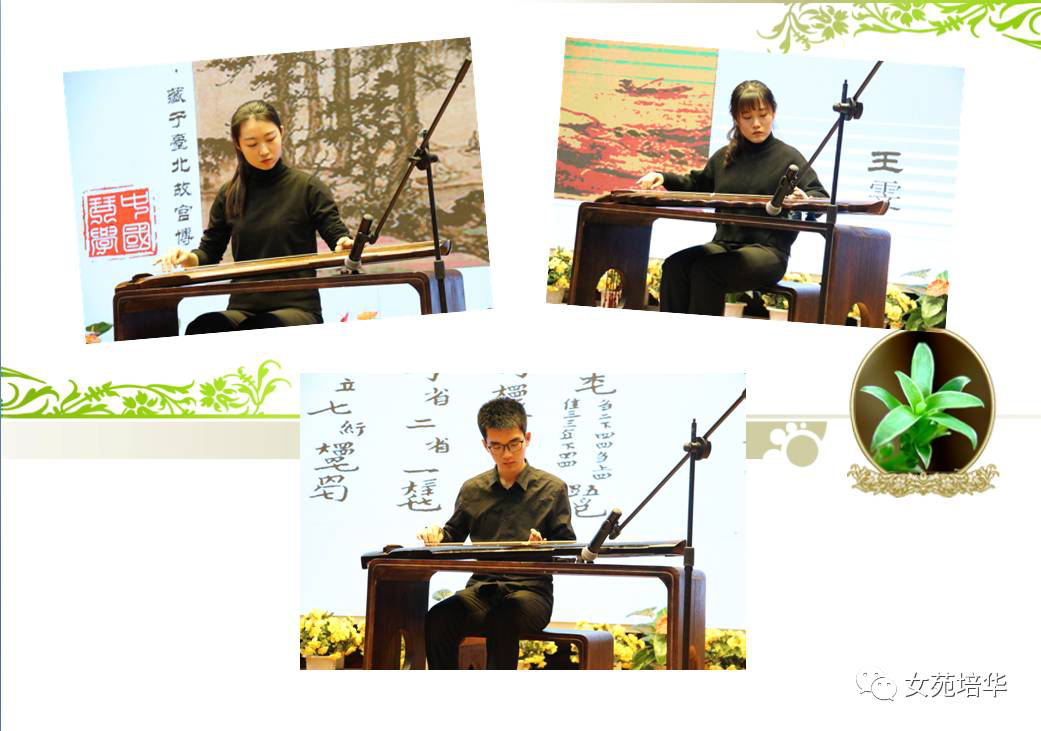 首先李教授从古琴的外形入手,为大家介绍了古琴的类别,它分为半箱式,伏羲式,神农氏,凤势式,连珠式,师旷式,灵机式等。紧接着她为大家讲述了古琴的历史,由此引出古琴名作,并让自己优秀的学员为大家带来精彩演绎。