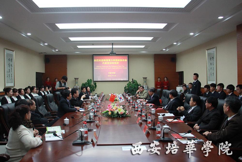 11月14日,韩国青少年团体协议会会长、世界道德重整韩国本部总裁车光善,兴士团理事长潘在喆,Green Family-Green Scout联合总裁郑振海,韩国4-H本部会长李洪耆,韩国Scout联盟事务总长金基德,韩国青少年联盟事务总长梁喆胜,韩国Scout联盟京畿北部联盟事务总长权九衍,韩国青少年团体协议会事务总长曺铉,韩国青少年团体协议会协力事业部长池世瑄一行在中国国际青年交流中心海外留学事业部常务副部长接克,共青团陕西省委副书记、陕西省青联副主席段小龙等人的陪同下来我校参观访问。陕西省青联副主席、我校理事长姜波,常务副院长王拴才,副院长杨定君,女子学院副院长金沙曼,国际交流中心主任秦泉安,韩国籍外教崔圣伯教授及部分老师、学生热情接待了代表团一行。